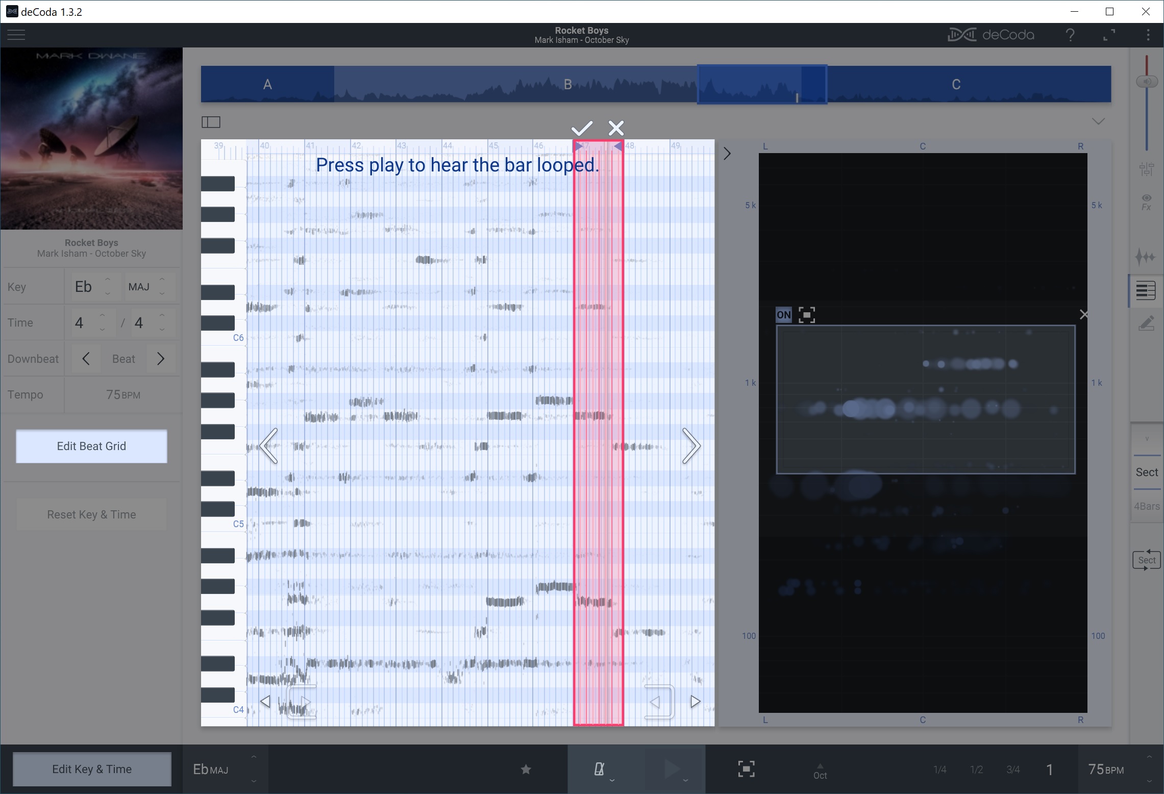 The deCoda project panel has a button to edit the beat grid. Press this button and you can draw a measure that aligns the grid with the audio music. Thanks to this feature, I didn’t have to guess note starts, stops and durations. Henceforth, I will make frequent use of beat grid editing!