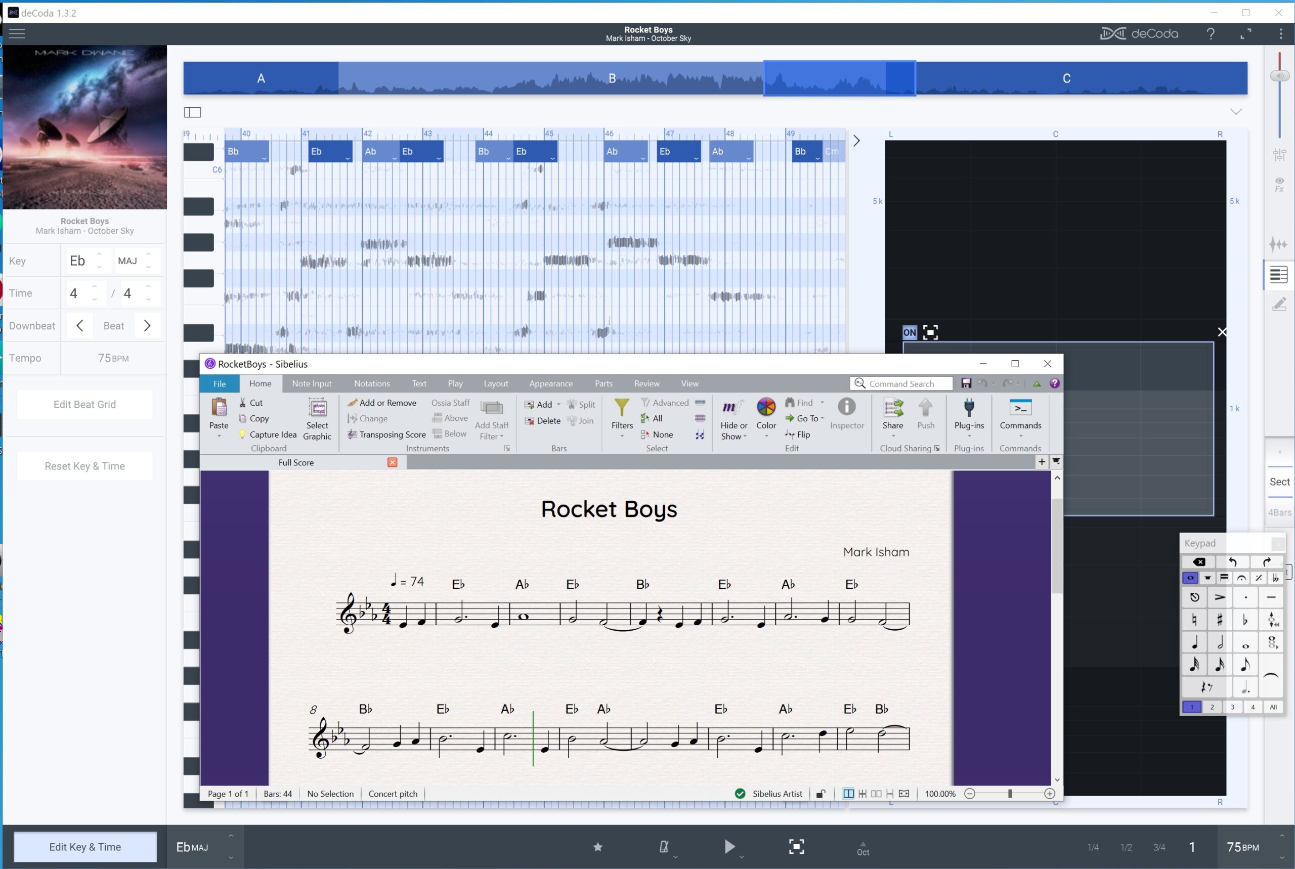 Overall, this has been a fun afternoon project. The process was good for ear training and I have a very simple lead sheet for “Rocket Boys”. Chalk another win for zplane deCoda (and Sibelius).